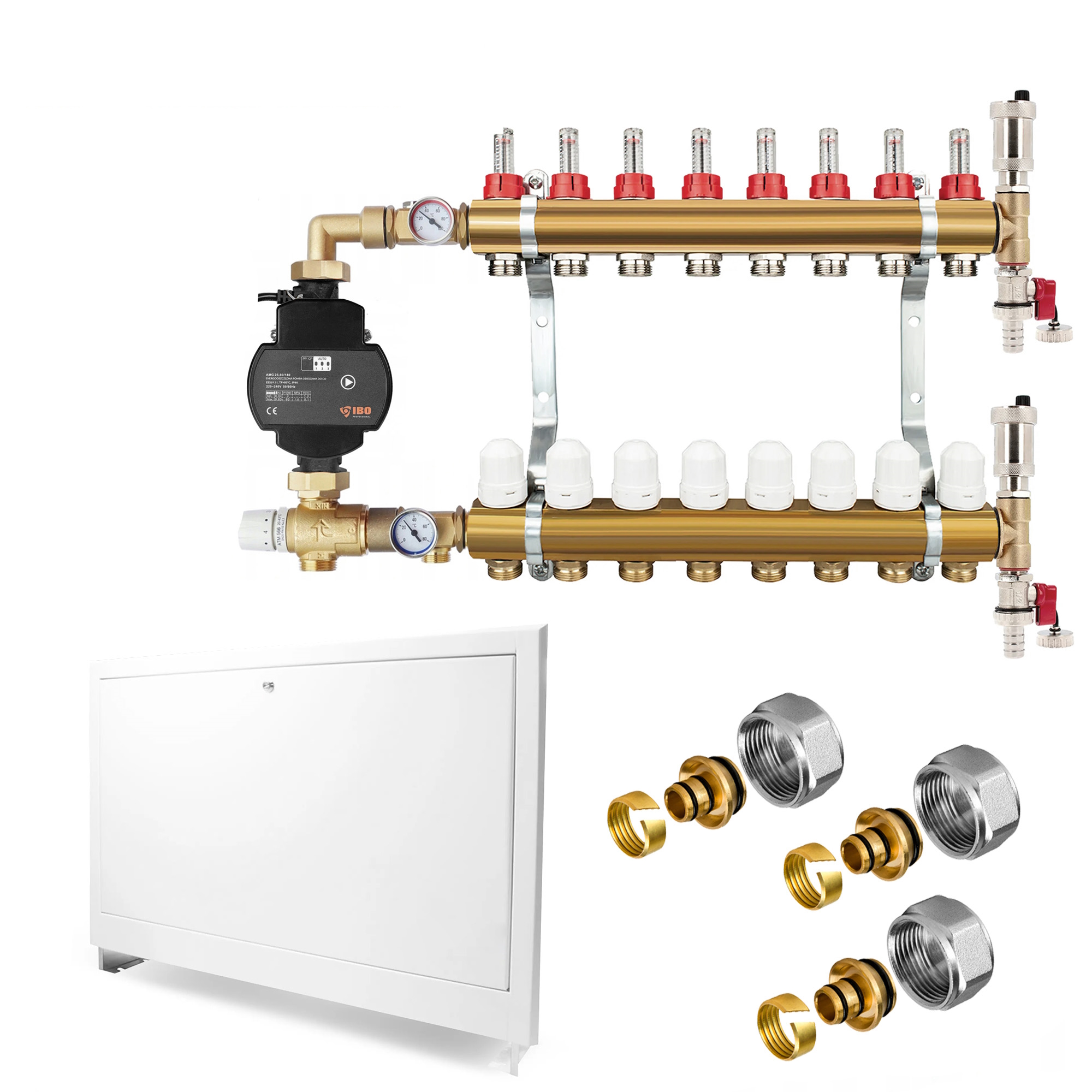 Colector de calefacción por suelo radiante con paquete de bomba y válvulas – Bomba ibo amg A – 7 circuitos